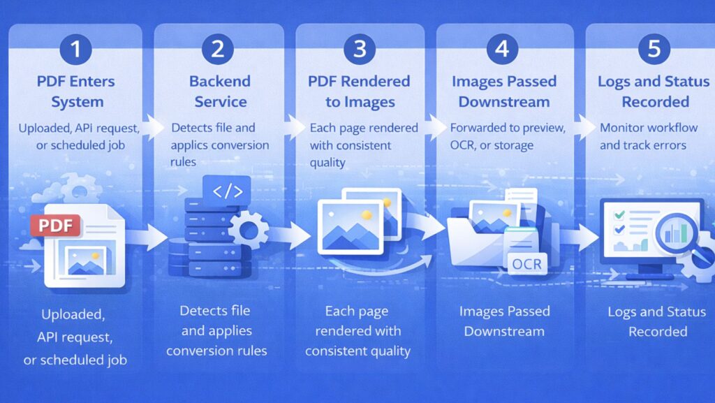 In an automated backend workflow, PDF-to-image conversion is treated as a standard processing step rather than a separate task. It follows a clear and repeatable process: