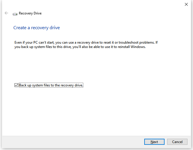 Step 1: Connect a USB drive with at least 16 GB of storage. Press Windows Key + S and type “Create a Recovery Drive”, then select it from the search results. Make sure to check the box next to “Back up system files to the recovery drive.”