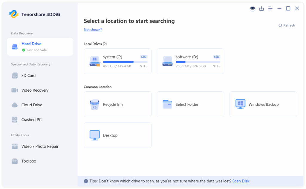How to fix insert your Windows installation or recovery media? Before proceeding, it’s recommended to first extract your data from the unbootable drive. Tenorshare 4DDiG offers a very accessible yet powerful data recovery solution for hard drives. It works effectively in various data loss situations, including drive failure, virus attacks, accidental deletion, and formatting errors. Plus, this free data recovery software can recognize over 2,000 file types and is fully compatible with all versions of Windows. Here’s how you can use it: