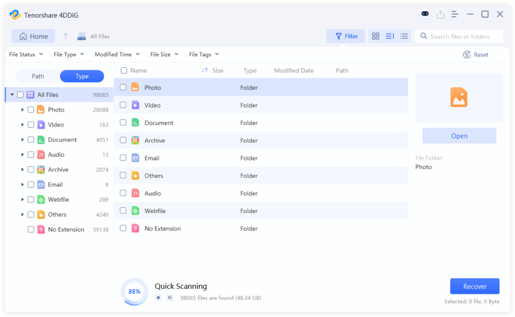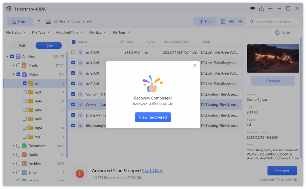 Step 2: 4DDiG will automatically scan the selected drive and display any recoverable files it finds. You can pause or stop the scan at any time, but for the best results, it’s recommended to let the scan finish completely.